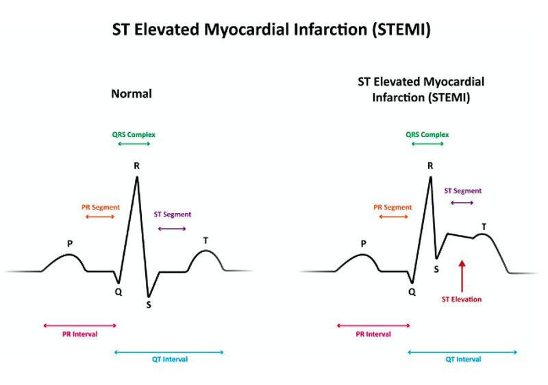 ST segment elevation in two contiguous leads of any ECG is indicative of a STEMI, as demonstrated in Figure 1 (Thygesen et al, 2007).