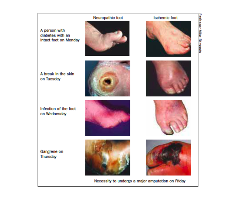 The signs of a red, hot, swollen foot should not be underestimated, as the progression from an initial relatively minor injury to unsalvageable tissue necrosis and overt gangrene can take as little as 48 hours (Figure 7) (Edmonds et al, 2020).