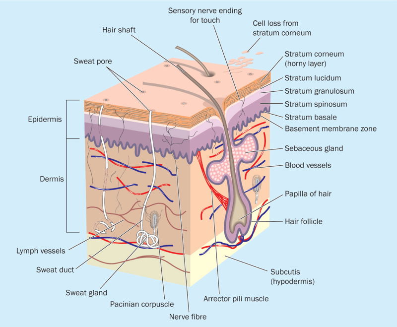 Skin, which is the largest and principal organ of the body, is a multifunctional membrane structure with a primary role in protecting the body surface from pathogens (Patton et al, 2023). It is composed of three layers — the epidermis, dermis and hypodermis (subcutaneous) —which are subdivided further into layers (Figure 2) (WHO, 2009a).