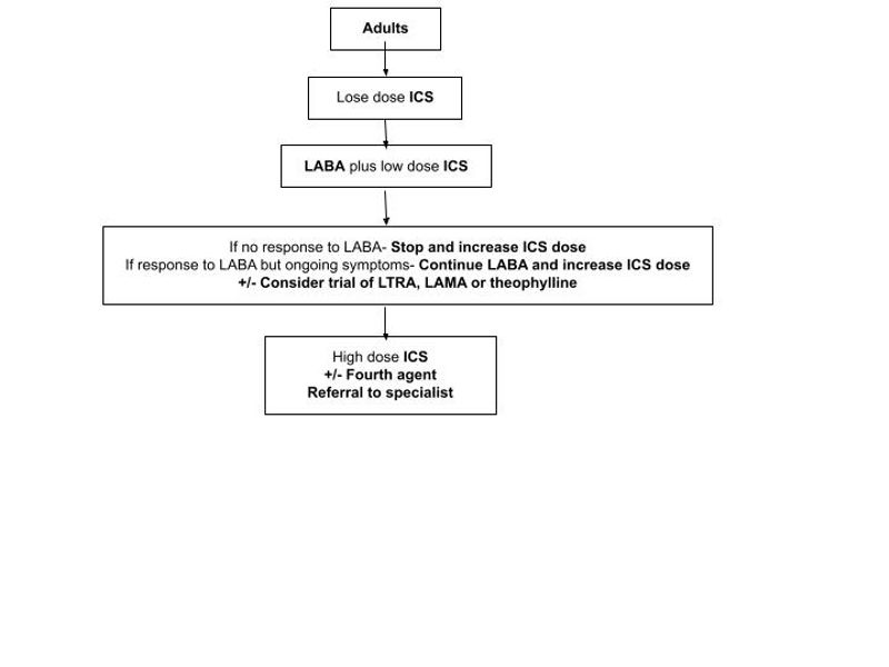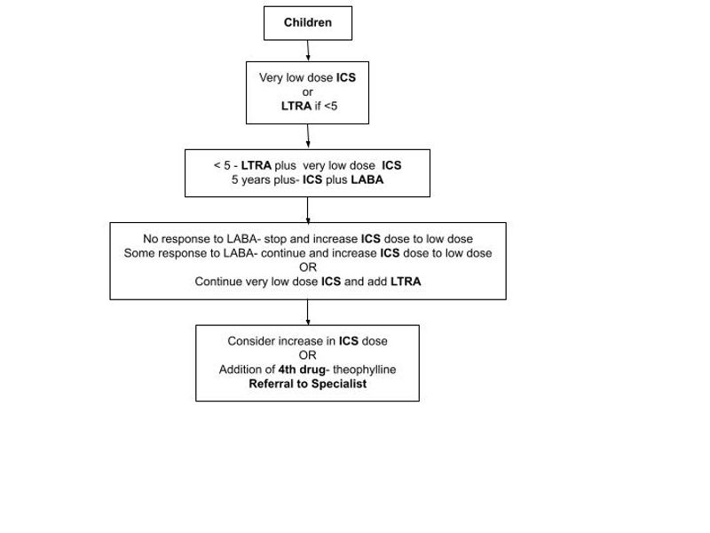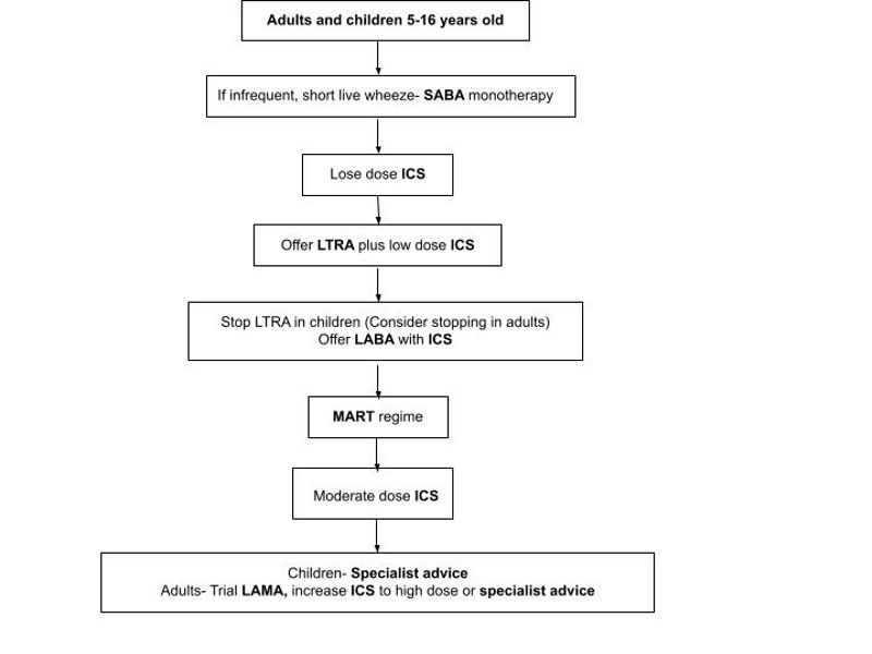 There is no cure for asthma. The aim of treatment is to manage the symptoms and prevent asthma exacerbations with the fewest medications as possible (Eggert and Majumdar, 2022). There are two main guidelines for stepwise treatments in the UK from NICE (Figure 1) and BTS/SIGN (Figure 2: adults; Figure 3: children)